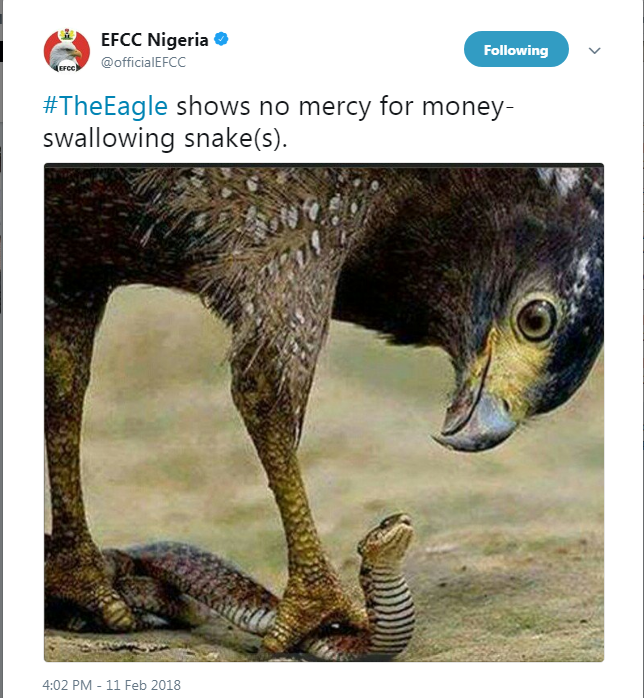 EFCC Shared a picture of an eagle trapping down snake, with captioned [b]”#TheEagle shows no mercy for money-swallowing snake(s)”[/b]