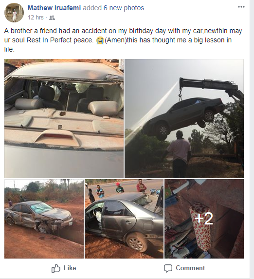 “A brother a friend had an accident on my birthday day with my car,newthin may ur soul Rest In Perfect peace. �(Amen)this has thought me a big lesson in life.”